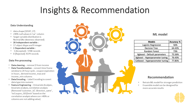 This is a binary classification problem to predict the accepted/rejected coupon status. Team has tried Logit, DT, RF, Xgboost and catboost. We got the best results from catboost .