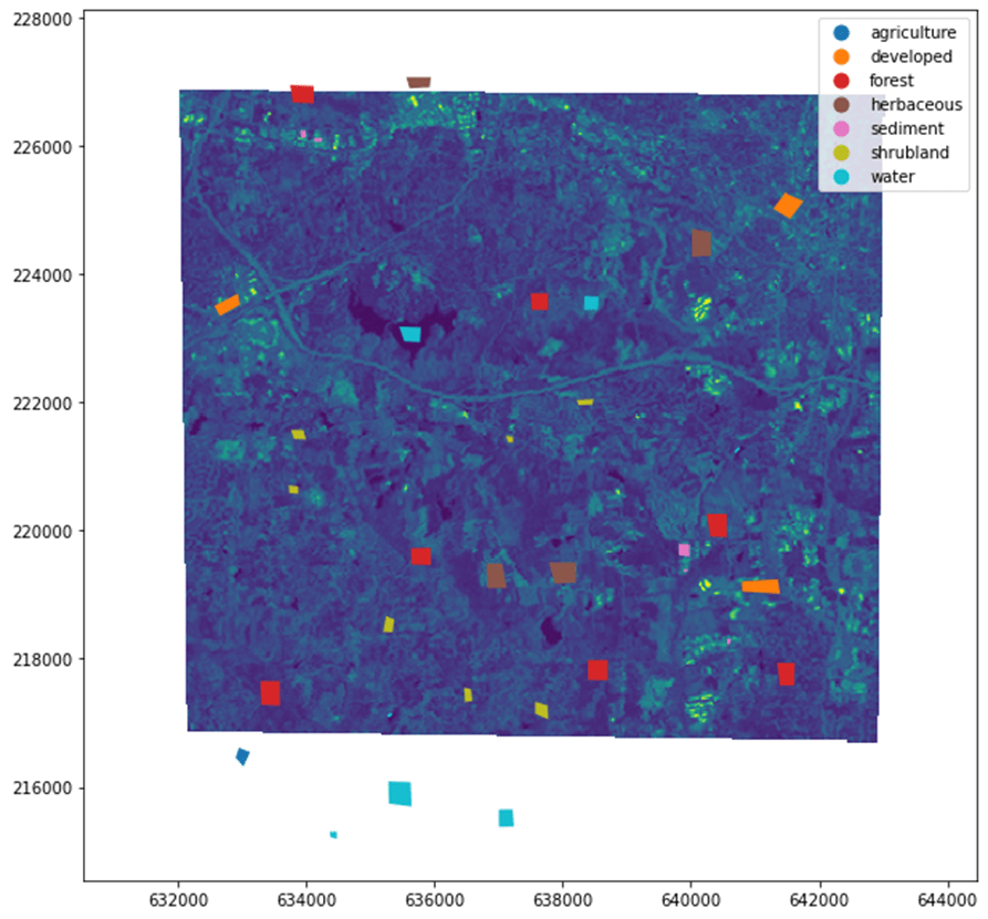 I developed a machine-learning model to classify satellite data (raster data) into one of the 7 labels namely agriculture, developed, forest, herbaceous, sediment, shrubland and water. I used RandomForestClassifier.