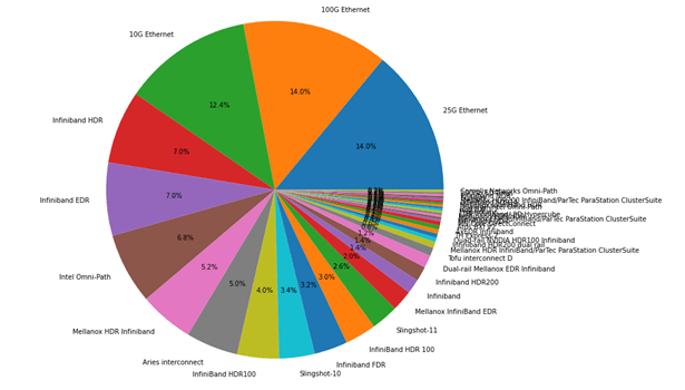 This is a pie chart depicting the different interconnects used by the supercomputers from the TOP500 list. It shows the information in terms of percentage.