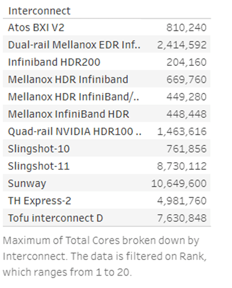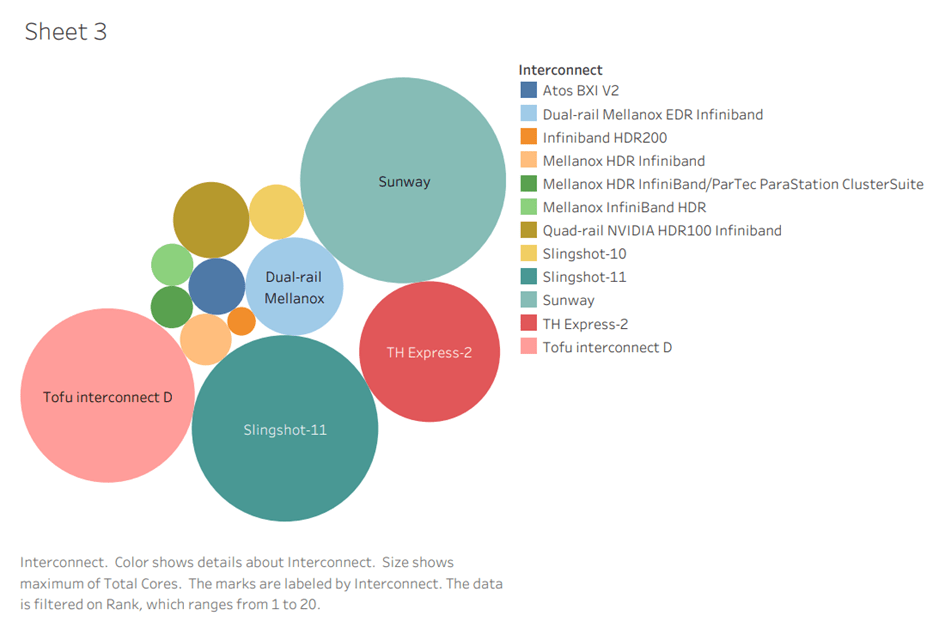 - Slingshot 11 and Mellanox HDR InfiniBand are the interconnects used by most systems in the Top-20 list.