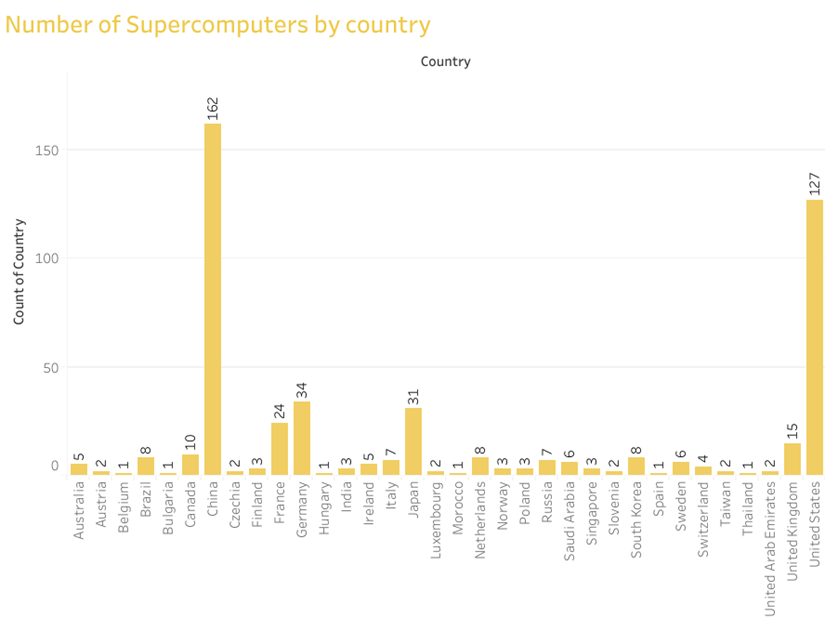 - Though China owns 162 (32.4%) of the Top500 Supercomputers, it only has 2 of its supercomputers in the Top20 list.