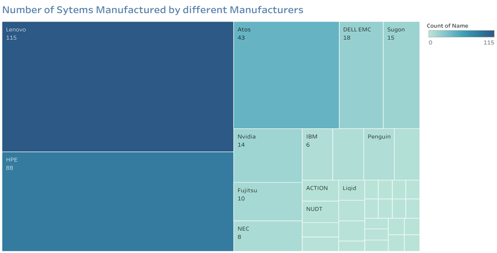 The Top500 list’s Manufacturers category refers to the businesses that make the supercomputers that are listed. Large computer manufacturers or vendors like IBM, Hewlett Packard Enterprise (HPE), Cray, Lenovo, Fujitsu, and Dell are typical examples of these businesses. It is observed from the above tree map and pie-chart that Lenovo manufactures 31.4% of all the