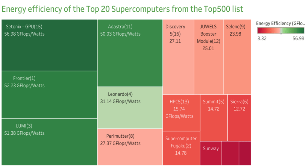 Frontier consumes way less power when compared to Supercomputer Fugaku. Interestingly, Frontier outperforms Supercomputer Fugaku and is ranked 1st in the list ( Fugaku is ranked second). LUMI and Leonardo consume way less power when compared to Summit Supercomputer. Likewise, Sierra consumes lesser power than Sunway TaihuLight. Perimutter and Selene outperform Tianhe – 2A in optimum power consumption.