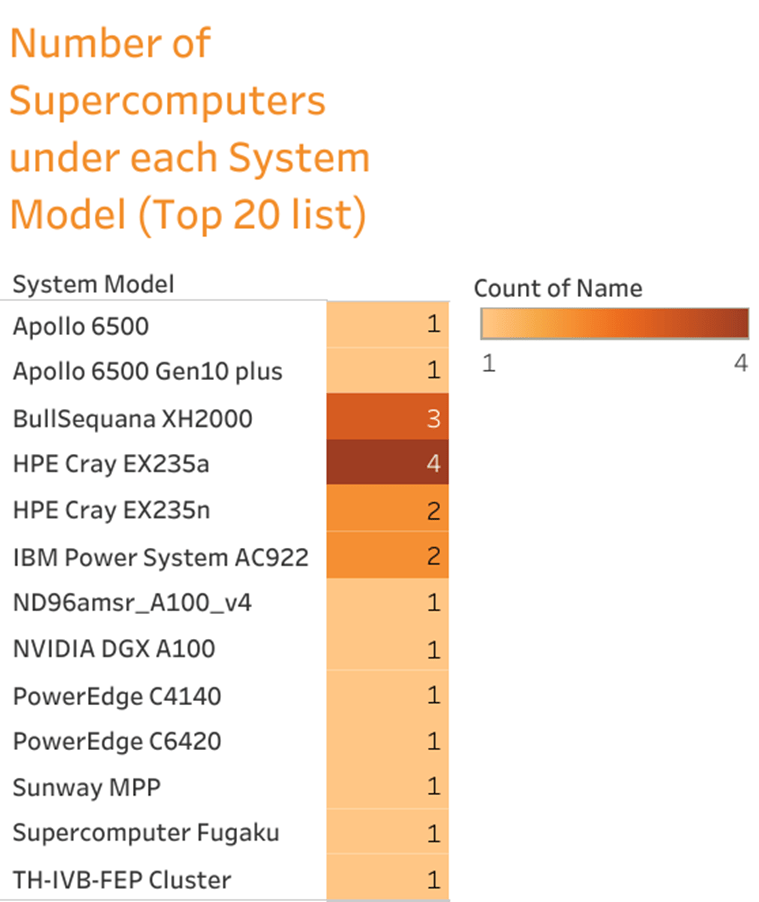 We came up with a total of 45 visualizations covering almost all the attributes from the Top500 list and the HPCG list. The below table summarises the type and count of visualizations. We published the visualizations on Tableau Public and have received 127 views so far. Given below are the links to navigate to the published visualizations: