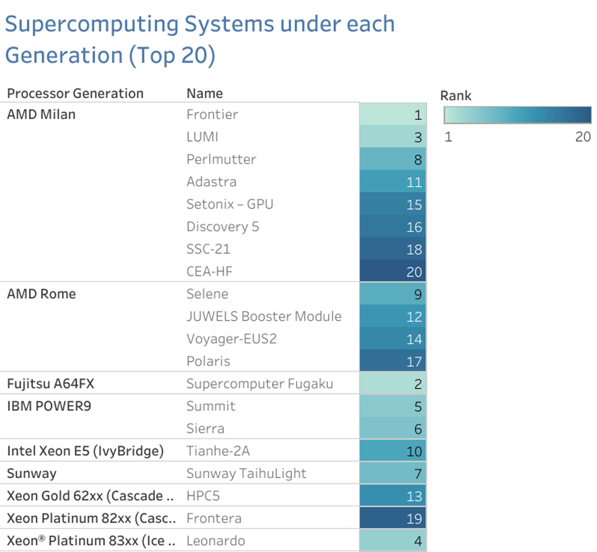 In the context of the TOP500 list, “generation” usually refers to the specific microprocessor architecture or technology node that a particular system or processor is based on.For example, Intel’s microprocessor architecture has gone through several generations over the years, including Sandy Bridge, Ivy Bridge, Haswell, Broadwell, Skylake, and more recently, the 11th generation Alder Lake processors. Similarly, AMD’s processors have gone through multiple generations, including the Ryzen and EPYC series.